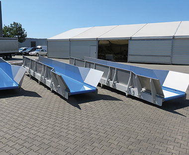The transfer conveyors by PMV Fördertechnik are deliverable for each optional laundry batch size, they are custom-made for storing or/and for the further transfer of the linen.